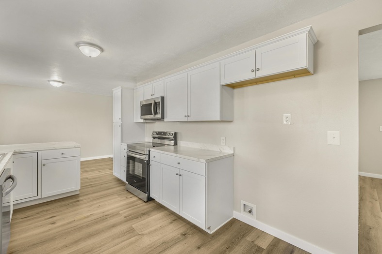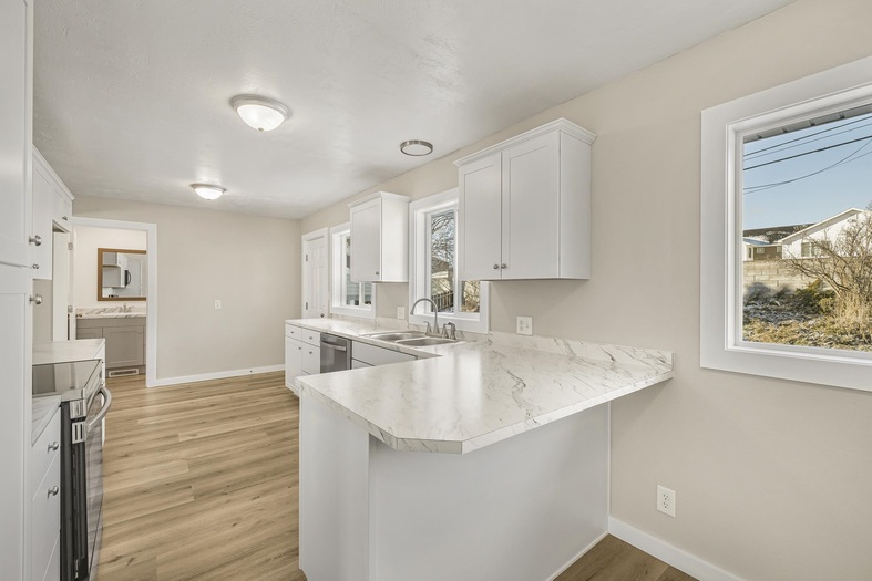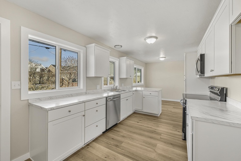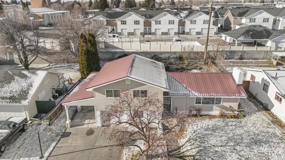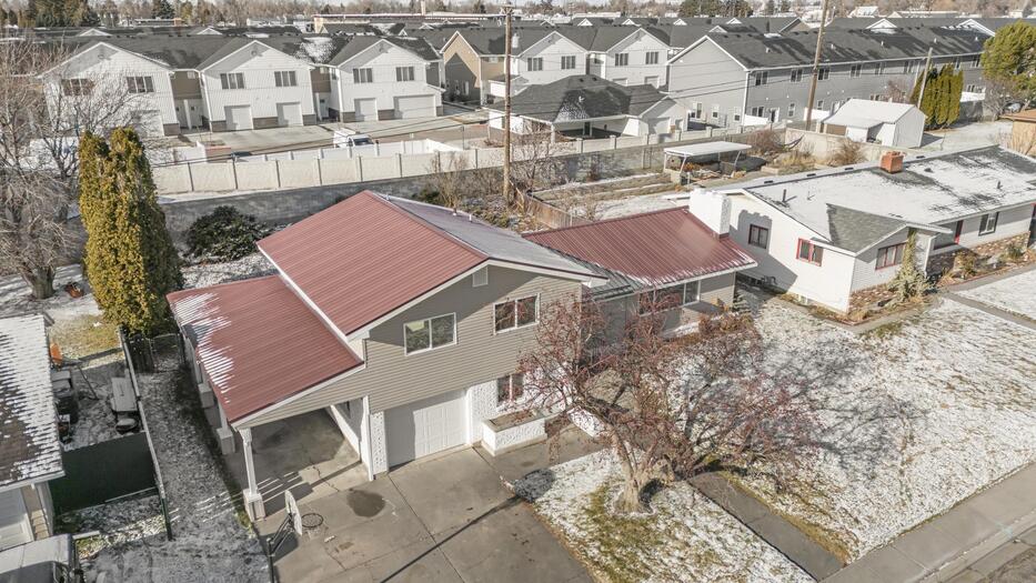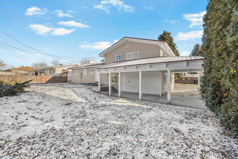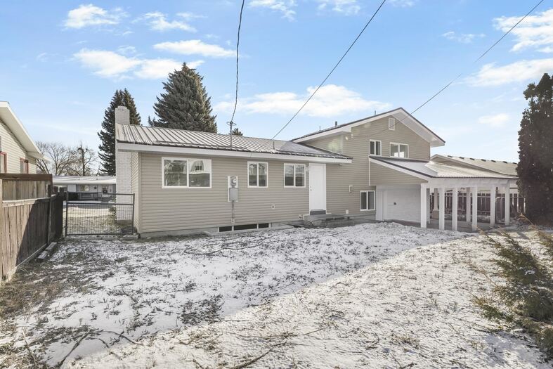 Welcome to this beautifully remodeled multi-level home filled with natural light and a fresh, neutral color palette throughout. The bright kitchen features crisp white cabinetry, stainless steel appliances, and updated finishes that create a clean, modern feel. The unique three-level split floor plan offers flexible living space and excellent separation for everyday living, work, or guests. A durable metal roof adds long-term value and low maintenance, while the attached carport provides convenient covered parking. Step outside to enjoy a spacious lawn and a covered back patio, perfect for relaxing, entertaining, or outdoor dining. This move-in-ready home blends style, functionality, and comfort in a layout designed for today's lifestyle.