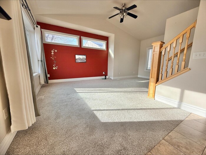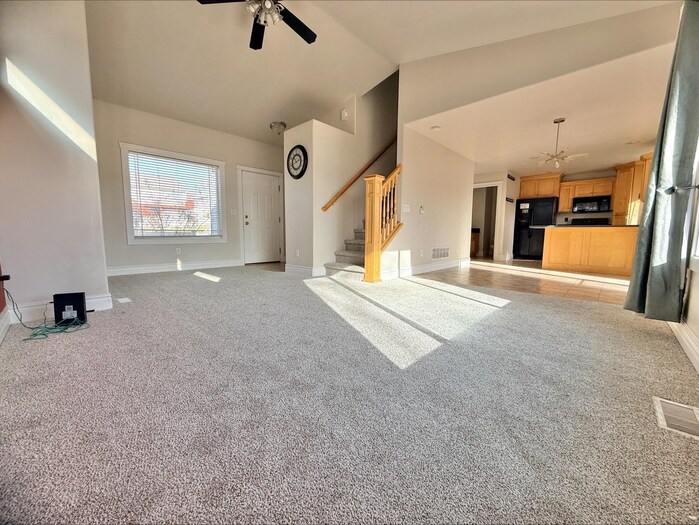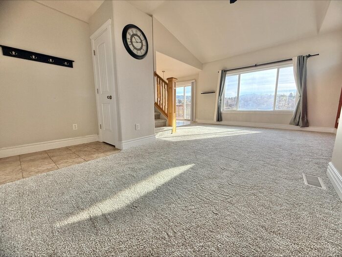 Charming twin home with beautiful views and conveniently situated next to the golf course and close access to I-15 . The inviting main level features a bright living room with a large picture window, a U-shaped kitchen with custom countertops, staggered cabinetry, and matching black appliances, plus a cozy dining nook. Upstairs offers three bedrooms on one level with nearby laundry for added convenience. The spacious primary suite includes a jetted tub and walk-in closet. The walk-out basement provides additional living space with a large family/rec room, full bathroom, and extra storage. A great combination of comfort, views, and location close to recreation and golf.