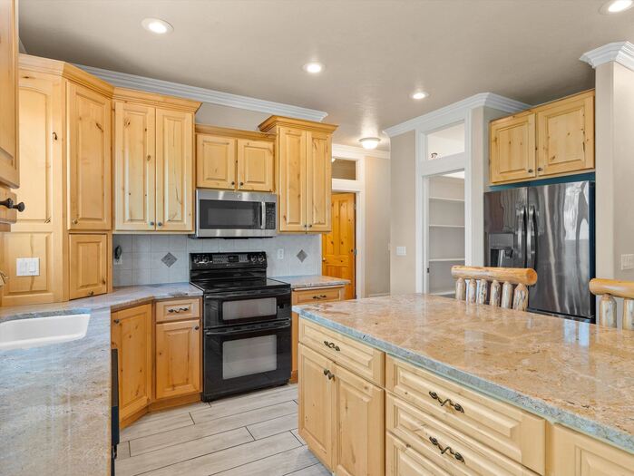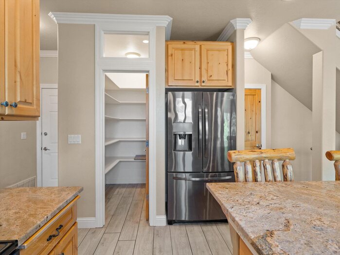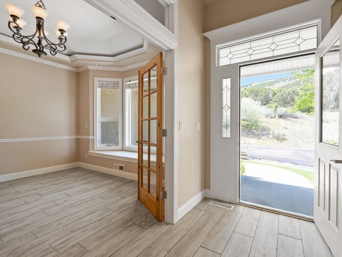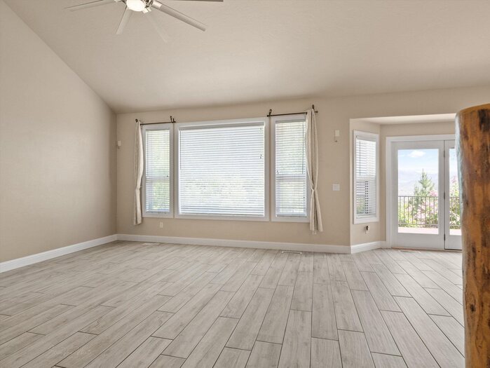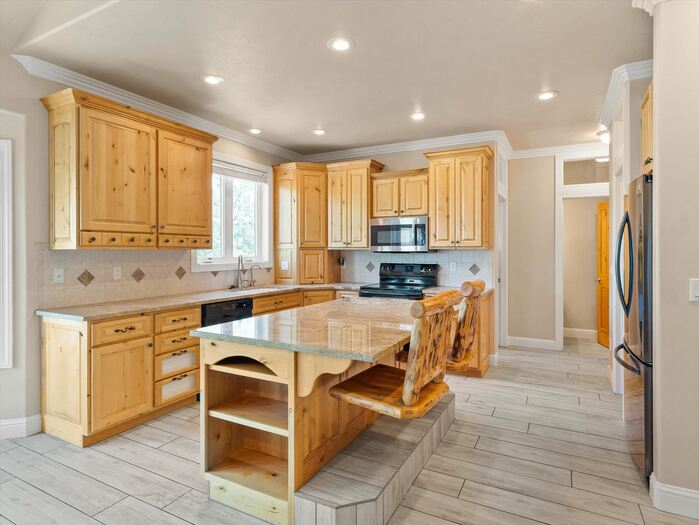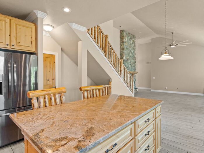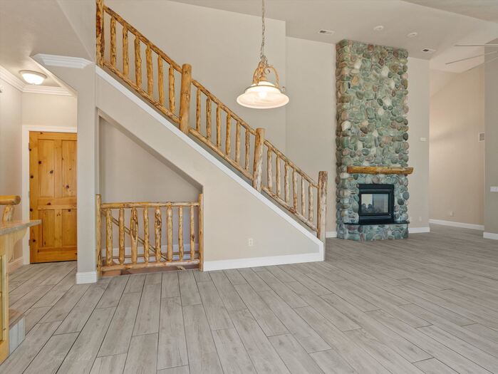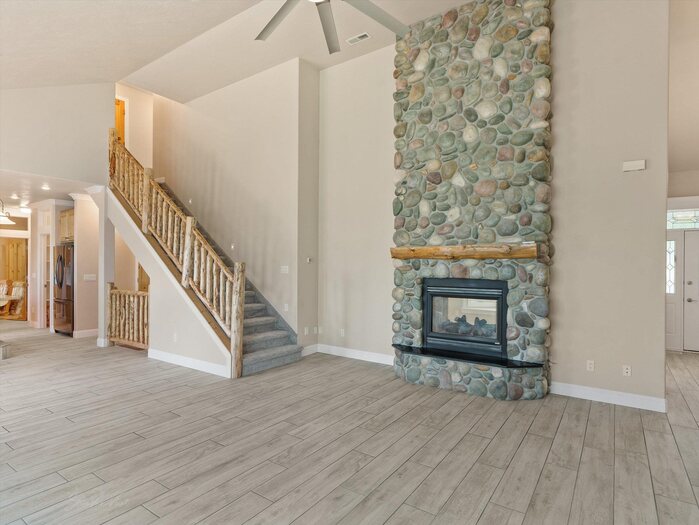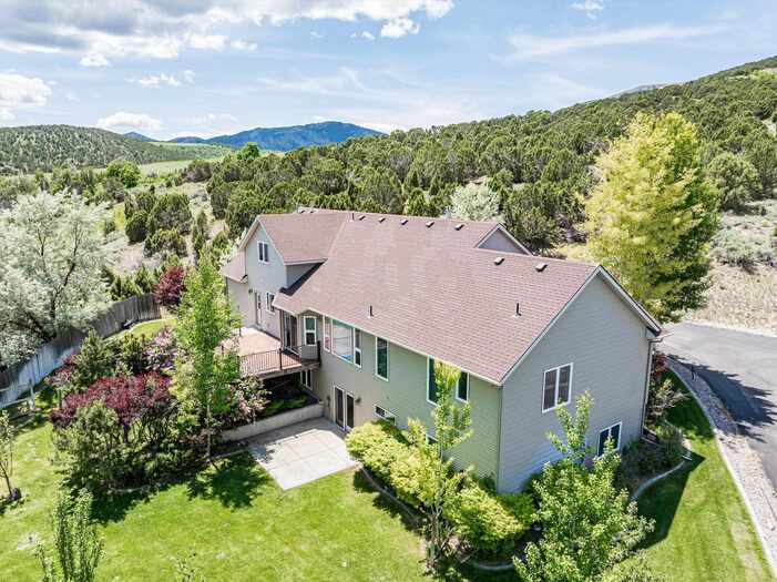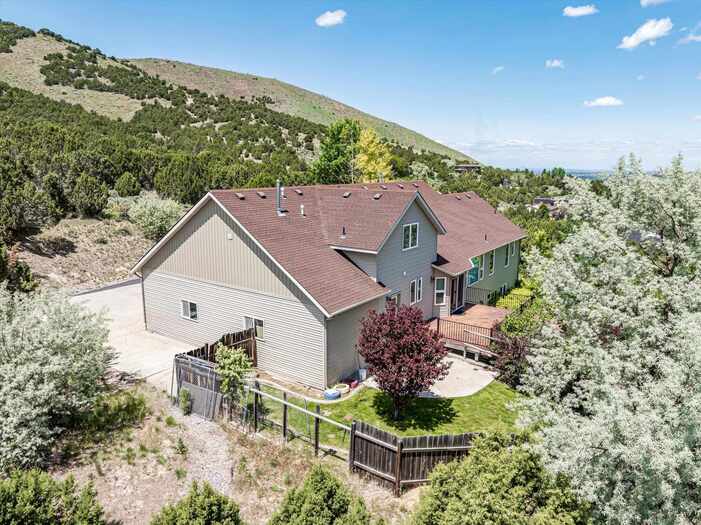 Gorgeous panoramic southern view from this 1.35 acre private lot at the end of a private drive. Access to forest service land and endless trails. Spacious custom home with main floor master suite with sitting area, large walk in closet and private bath. Office with two way fireplace, family room with vaulted ceilings and fireplace with rock all the way to the top of the vault. Chef friendly kitchen with center island and large walk in pantry, main floor utility. Upstairs offers two large bedrooms with walk in closets large bath with double vanity and separate heating and cooling. Walk out basement has kitchenette, family room with gas fireplace, two bedrooms with walk in closets, bath, hobby/craft room and additional room for workout and extra laundry hookups. Top it all with a 4 car garage with one bay going double deep, and RV parking.