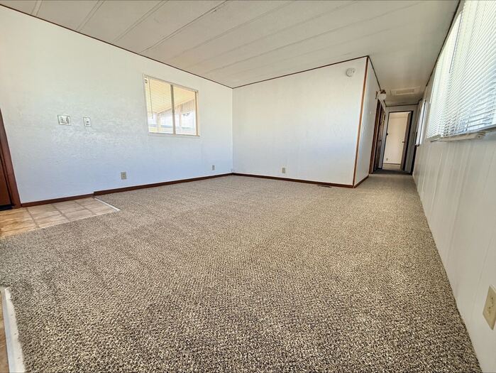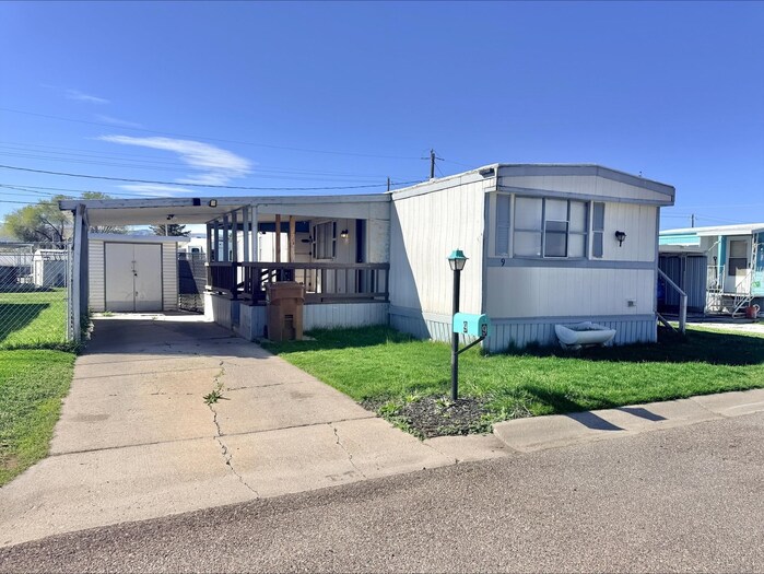 This mobile home offers both comfort and functionality, featuring a long two-car driveway with a covered carport, a spacious covered front deck, and a fenced yard—ideal for outdoor enjoyment and added privacy. A detached storage shed provides convenient extra space. Inside, the home features a bright and open living room with large windows that provide abundant natural light, along with brand-new carpet and fresh paint throughout. The kitchen comes equipped with essential appliances, including a refrigerator and stove, and flows into an adjacent dining area. Washer and dryer hookups are conveniently located just off the kitchen. Down the hallway, you'll find a secondary bedroom with a Jack-and-Jill–style bathroom accessible from both the bedroom and the hall. The primary bedroom includes a private ensuite bathroom complete with a separate soaking tub and shower. Located in Camelot Estates off Chubbuck Rd. Lot rent is $495 includes water/sewer/garbage.